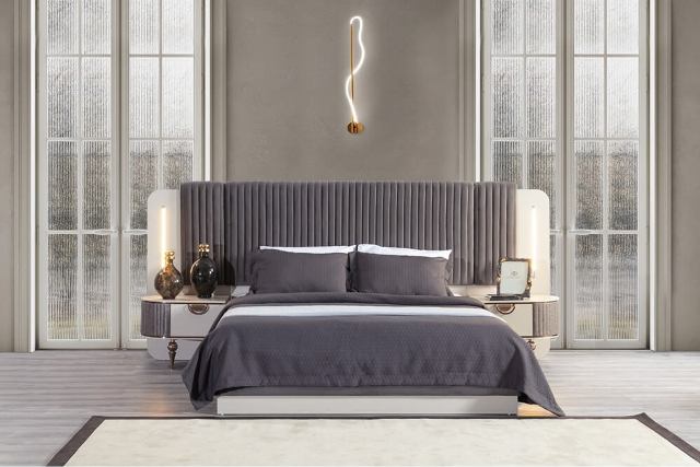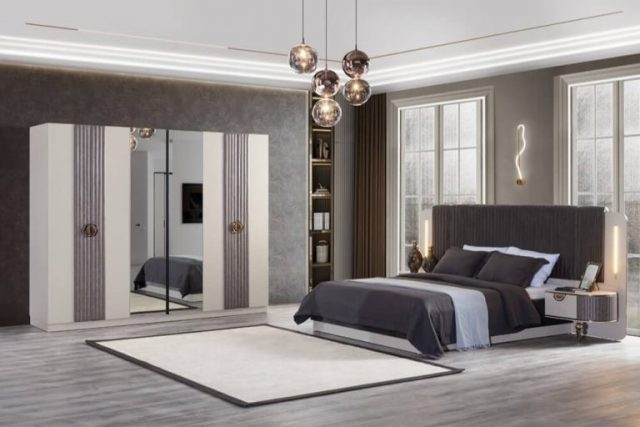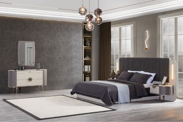 Современная мебель для спальни Атлантис представлена в нашем магазине мебели в сером цвете. Мебель сделана из МДФ высокого качества. Коллекция мебели для спальни Atlantis сделана в комбинации двух цветов- белый, серый. Такая спальня подойдет в подростковую комнату для мальчика или в молодежную комнату для мужчины. Большое изголовье обшито серой велюровой тканью и оснащена подсветкой. Большой шестидверный шкаф имеет удобные полки, вешалки и ящики для хранения.