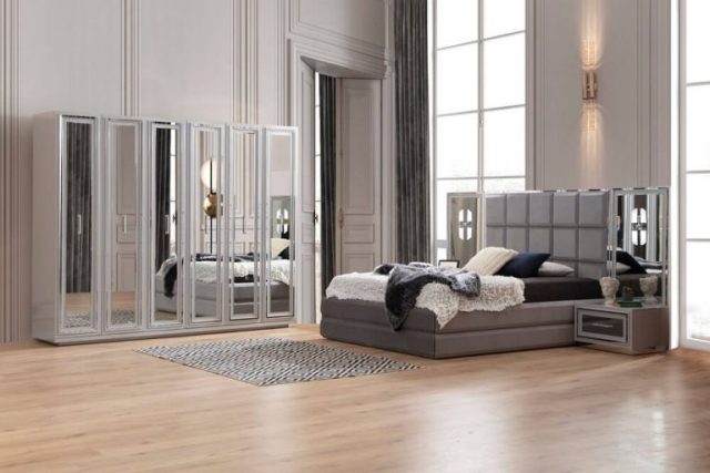 Красивая серая мебель для спальни Призма. Большое серое мягкое изголовье в комплекте с тумбочками прикроватными и зеркальным панно создает красивый гарнитур для отдыха. Вы можете купить кровать с подъемным механизмом в размере спального места 1600*2000 или 1800*2000. Можно купить отдельно туалетный столик или шкаф с зеркалами.