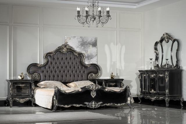 Красивая элитная спальня Мона Лиза представлена в нашем интернет-магазине мебели в черном цвете. Эту коллекцию Мона Лиза можно сделать в любом цвете который подходит в интерьер Вашей спальни. Кровать сделана с высоким резным изголовьем в стиле капитоне. Вся мебель сделана в стиле классического барокко с резными узорами на фасадах. Большой шкаф сделан как шкаф-купе с зеркальными раздвижными дверями.