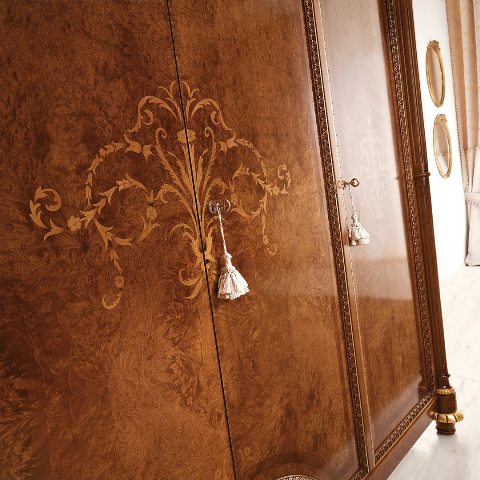 Спальня выполнена из натурального дерева в красивом насышеном ореховом цвете с цветочным орнаментом на фасадах.