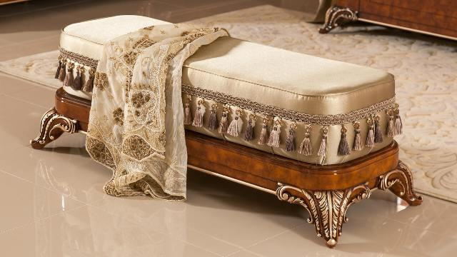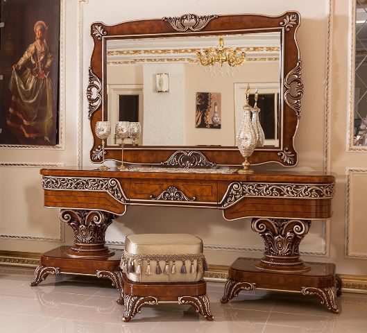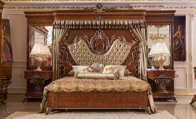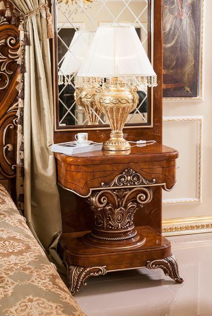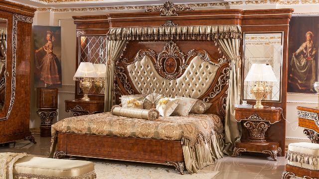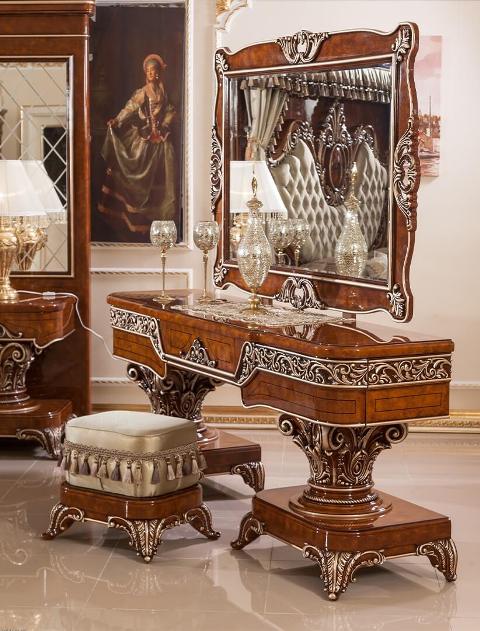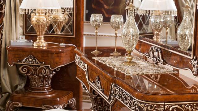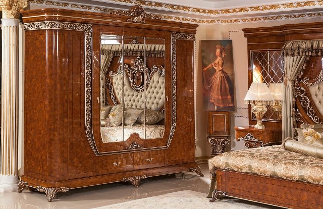 Классическая резная мебель для спальни Якут в цвете орех с золотом. Такая спальня очень красиво украсит интерьер Вашей спальни. В этом комплекте ВЫ сможете заказать кровать двухспальную, 2 тумбы, туалетный стол с зеркалом, пуф, большой шкаф, банкетка. Также можно заказать настенное панно в этом же стиле. Можно покупать спальню Якут и по элементам. Или минимальным комплектом кровать и 2 тумбочки.