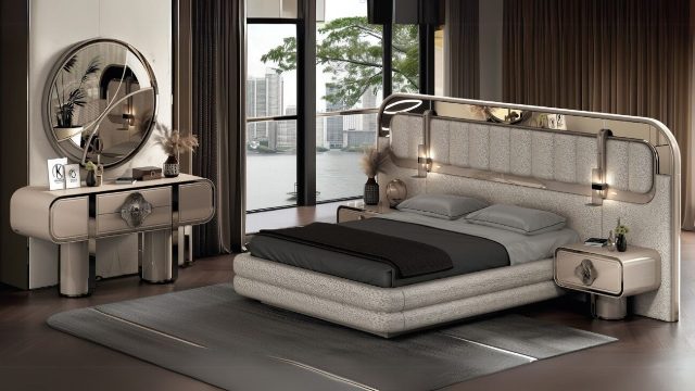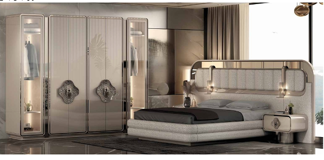 Спальня сделана из высококачественных материалов в нежном сером цвете, ( мокко), темный беж.