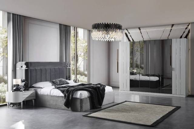 Красивая серая мебель для спальни Кайра представлена в нашем магазине мебели в Киеве в комплекте- кровать, 2 тумбочки, комод с зеркалом, шкаф 6 дверей.
