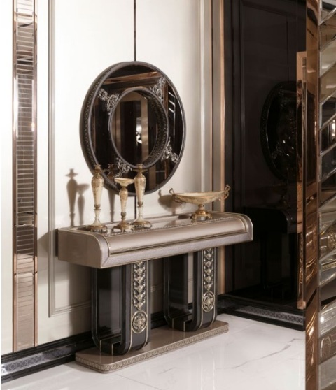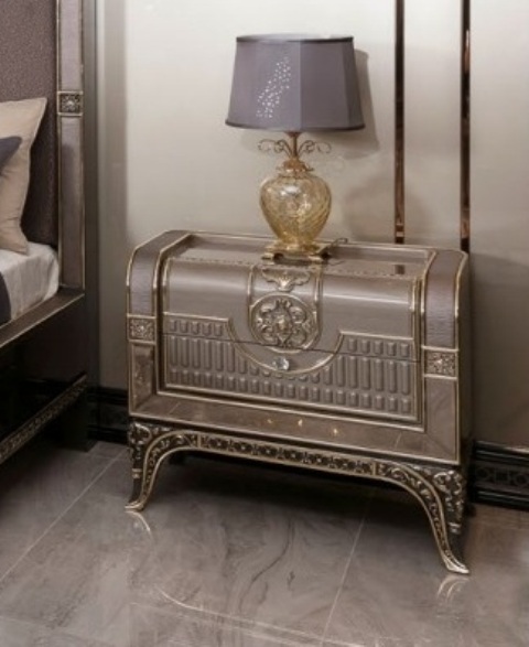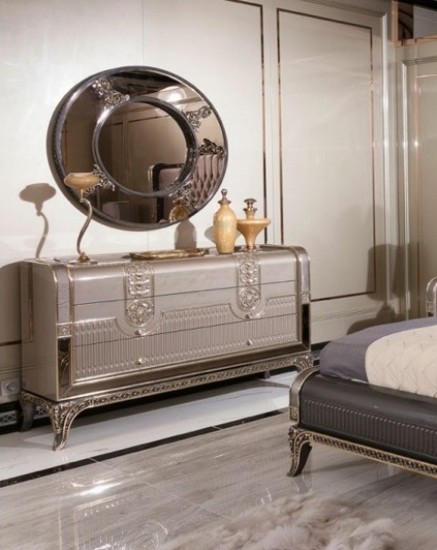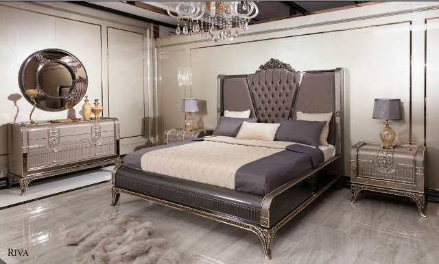 Турецкая мебель для спальни Рива. Большая кровать с мягким изголовьем в дорогой ткани с декоративным декором красиво украсит интерьер Вашей спальни. В комплекте с тумбочками кровать приобретает королевскую красоту. На фасадах всей мебели красивые резные декоры.