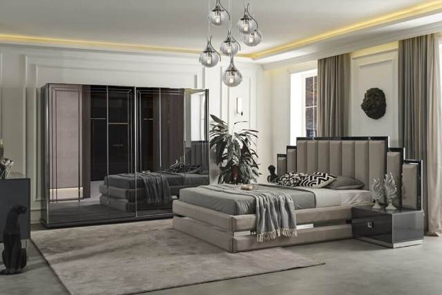 Красивая современная мебель для спальни с зеркальными фасадами Олимпия. Спальня сделана из МДФ высокого качества с зеркальным напыление. Кровать с большим мягким изголовьем отделана мягким велюром и вставками из зеркала и металла.