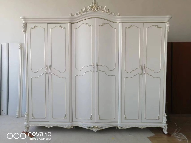 Красивый шкаф для одежды в стиле барокко. Шкаф представлен в белом цвете с резной короной покрытой золотой патиной. Шкаф шестидверный и прекрасно оборудован полками, штангой для вешалок и имеет ящики для мелких вещей.