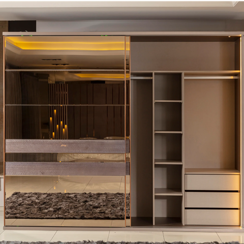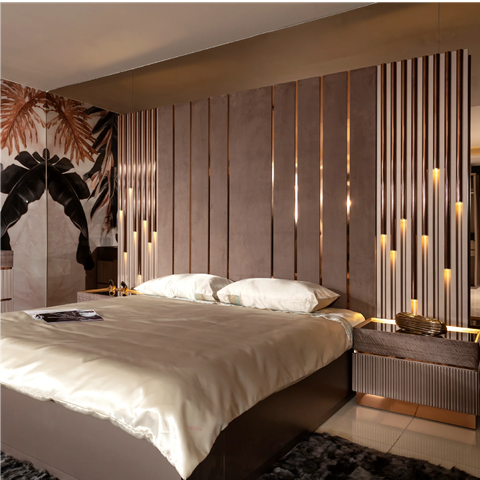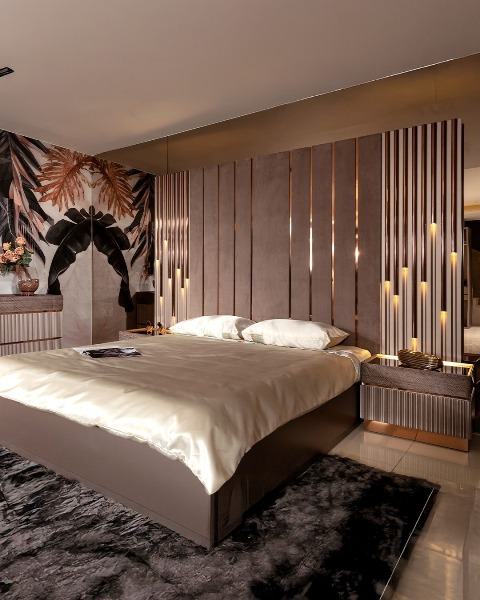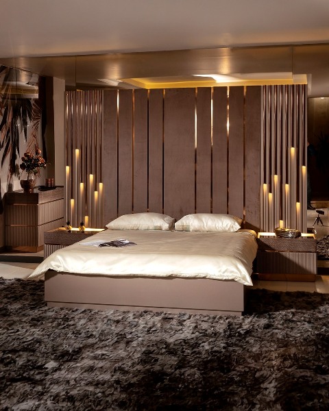 Изголовье кровати отделано зеркалами и красивой декоративной подсветкой.