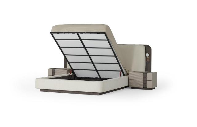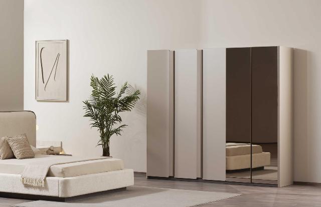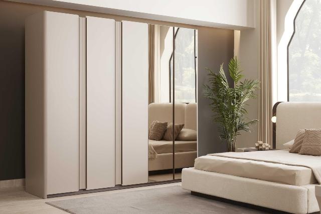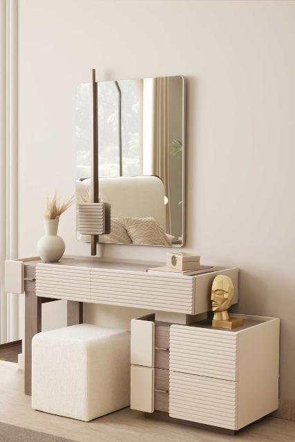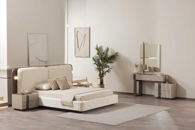 В комплект входит – мягкая кровать с подъемным механизмом, прикроватные тумбочки, туалетный стол с зеркалом, шкаф.