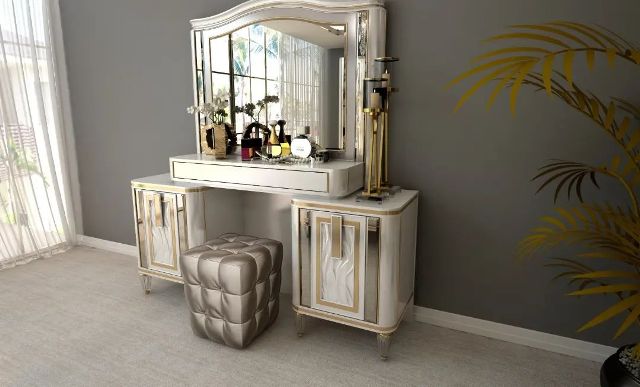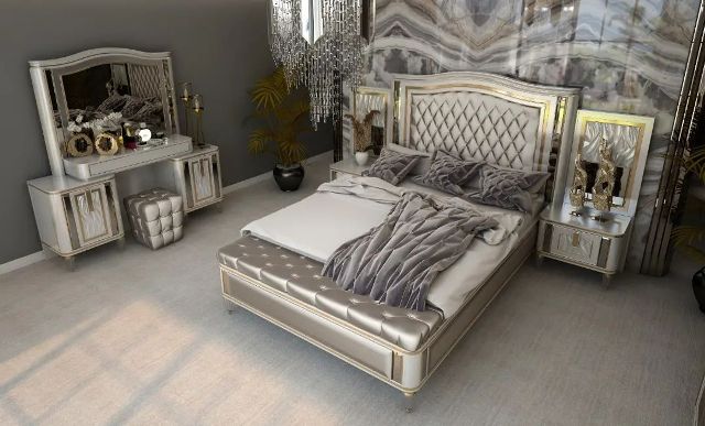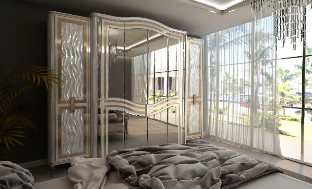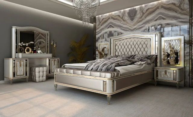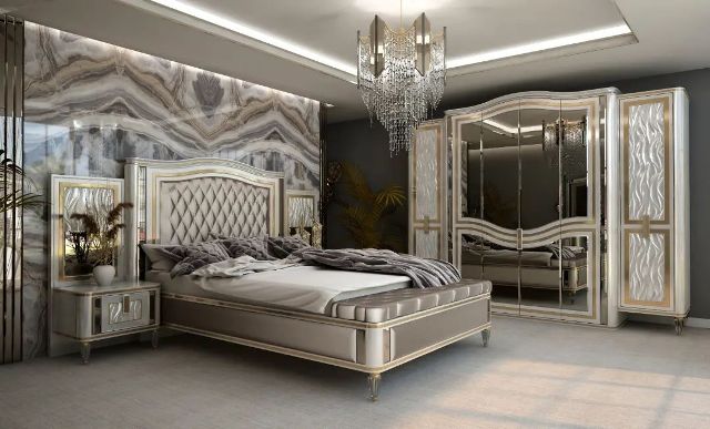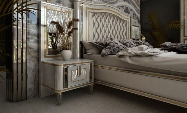 Спальня Лиссабон сделана в сочетании современного классического стиля и стиля барокко с дизайнерской отделкой из золота. В комплект спальни входит большая двухспальная кровать, прикроватные тумбочки, туалетный столик, шкаф с зеркалами. Спальню можно купить полным комплектом или заказать отдельные единицы мебели.