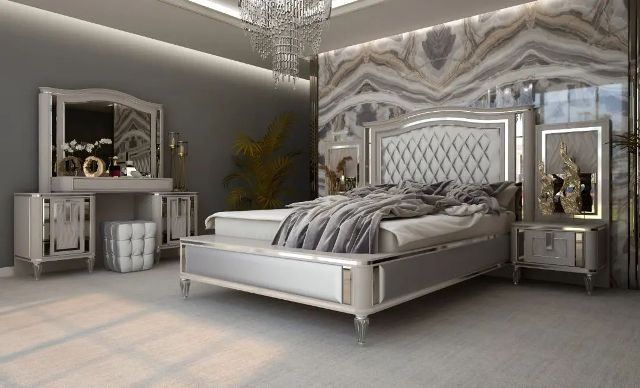 Спальню Лиссабон можна заказать в нашем магазине мебели в Киеве. Спальня выполнена из дерева и МДФ с серебряным декором. Спальню можно купить полным комплектом или кровать и 2 тумбочки.