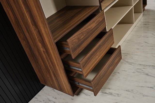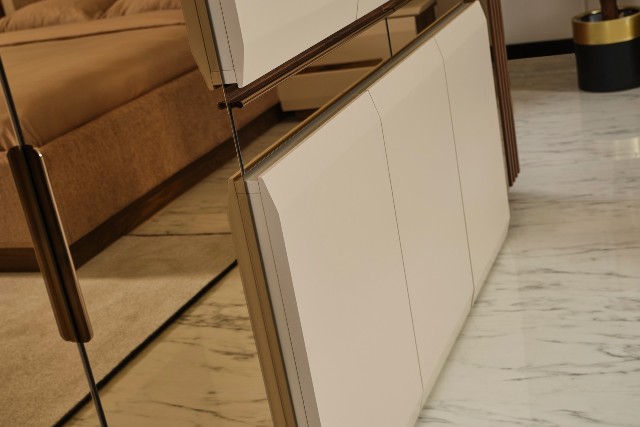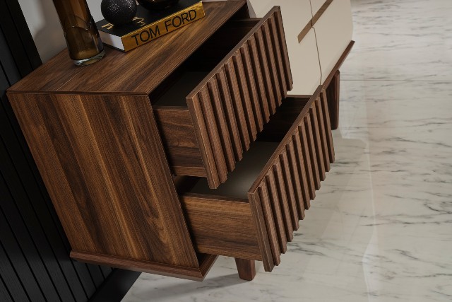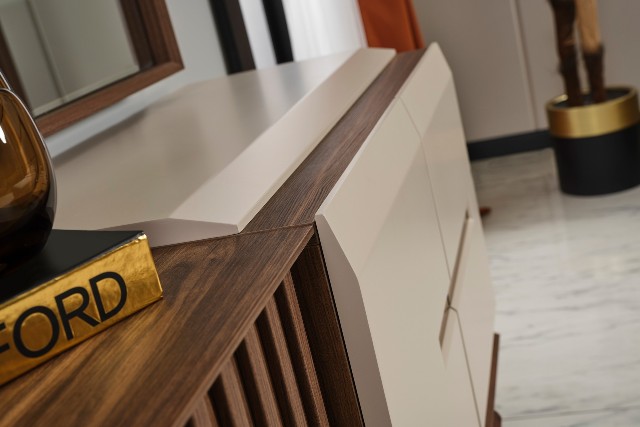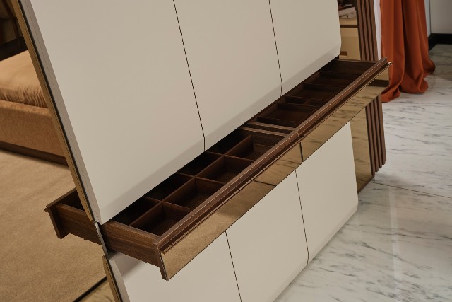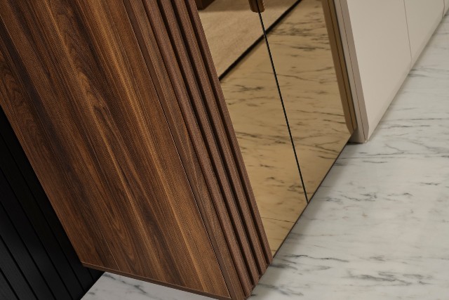 Интересная модель спальни Монза в комбинации ореха зебрано и белого. Кровать с подъемным механизмом сделана в сочетании дерева и мягкой красивой ткани барашек- букле. Стильное изголовье кровати отделано деревянным декором – рейка, что гармонирует со всем комплектом спальни. Прикроватные тумбочки имеют дополнительный скрытый ящик. Шкаф для одежды помимо полноценного наполнения имеет отдельный выдвижной ящик для мелких вещей – галстуки, пояса, косынки, шарфы.