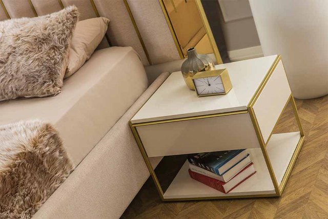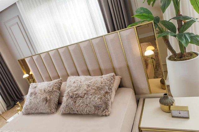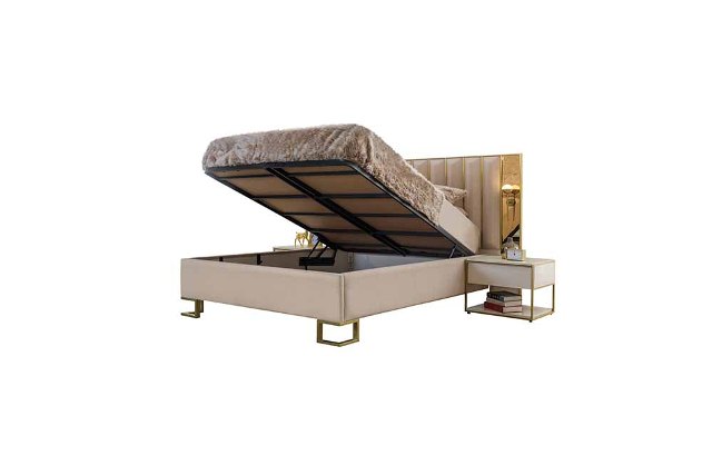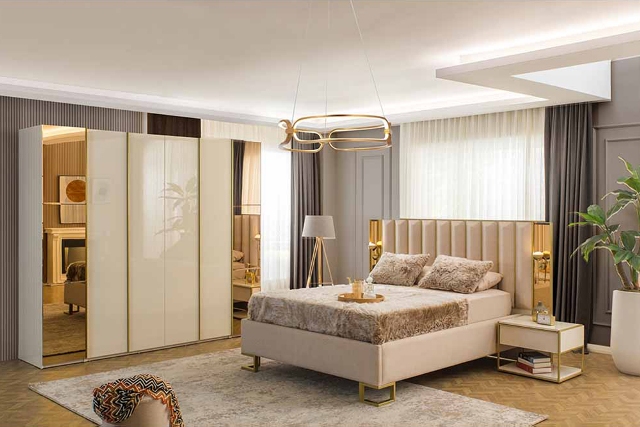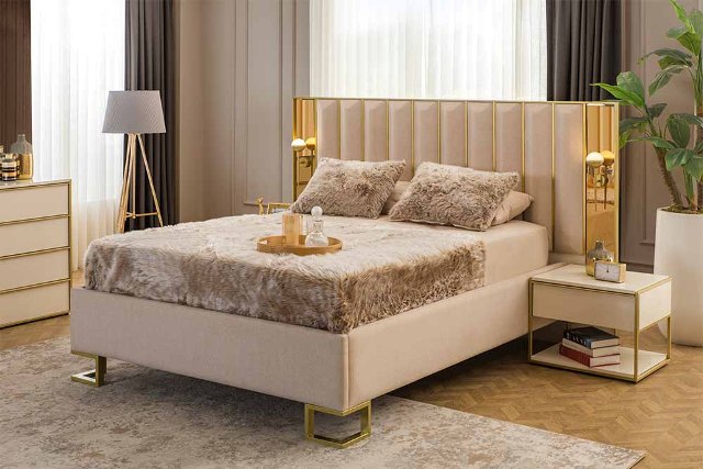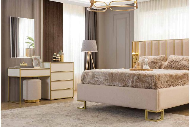 Современный мебельный гарнитур Малерон можно купить в нашем магазине мебели в Киеве. В комплект спальни входит кровать с подъемным механизмом, 2 прикроватных тумбочки, туалетный столик, зеркало, пуф, шкаф 6 дверей. Спальня сделана из МДФ высокого качества с золотым декором.