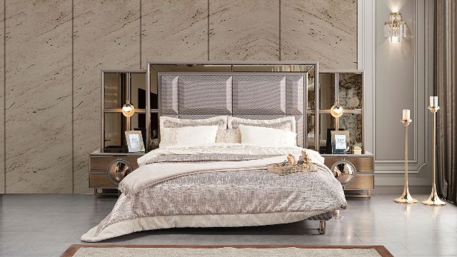 Красивая мебель для спальни с золотыми зеркальными фасадами представлена в нашем магазине мебели в Киеве. Спальню можно купить полным комплектом или отдельными элементами мебели.