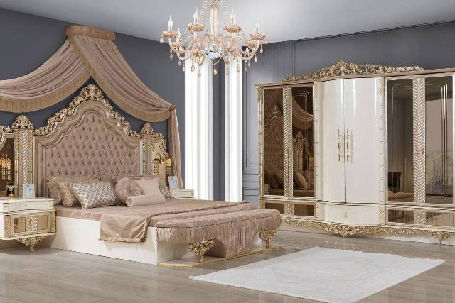 Спальня Принцесса представлена в нашем магазине мебели в Киеве. В комплект спальни вжодит большая кровать с высоким резным изголовьем, 2 прикроватные тумбочки с зеркальным панно которые красиво и стильно дополняют изголовье кровати. Трюмо с большим зеркалом и множеством ящиков для мелочей. Большой шестидверный шкаф с зеркалами.