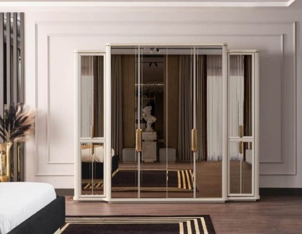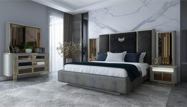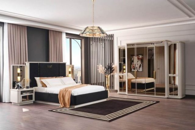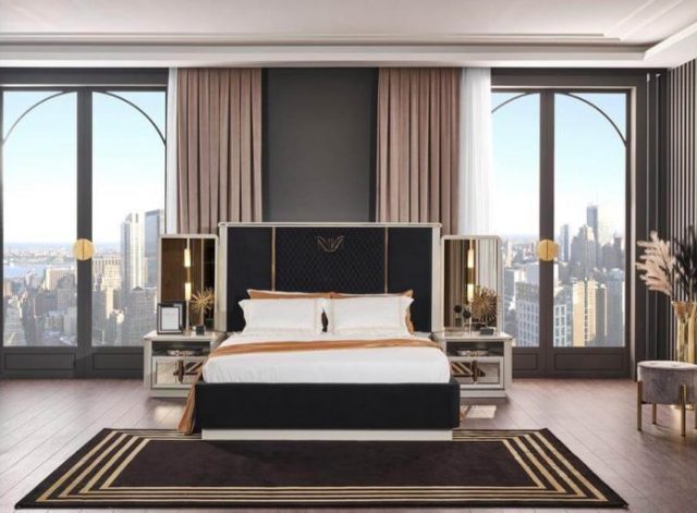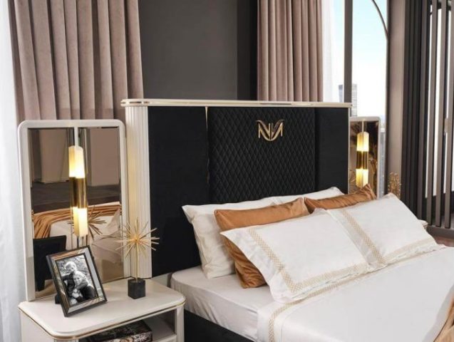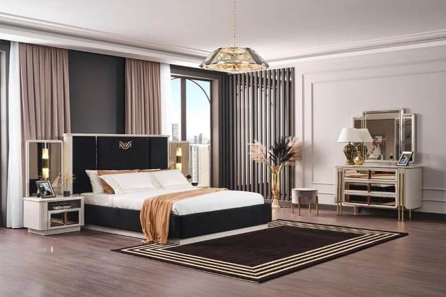 Современная турецкая мебель для спальни Хилтон из высококачественного МДФ с золотой фурнитурой и отделкой представлена в нашем интернет-магазине мебели с черной велюровой кроватью. Кровать с тумбочками красиво составляют гарнитур для сна. Такой минимальный комплект можно купить отдельно или заказать полный комплект спальни Хилтон.