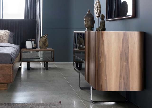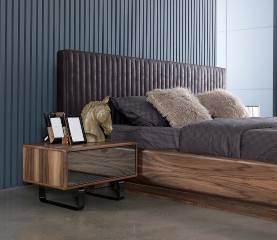 Современная мебель для спальни Палермо представлена в цвете орех. Двухспальная кровать Палермо сделана с мягким изголовьем. Прикроватные тумбочки и комод сделаны в комбинации орехового МДФ и зеркальных фасадов. Большой шкаф купе в ореховом корпусе с зеркальными фасадами дверей.