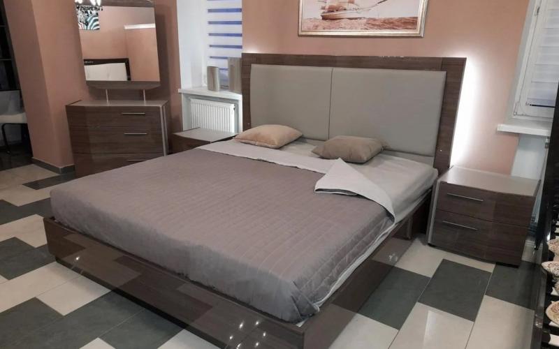 Особенностью гарнитура являются выгнутые фасады комода и тумбы, а также обивка изголовья экокожей.