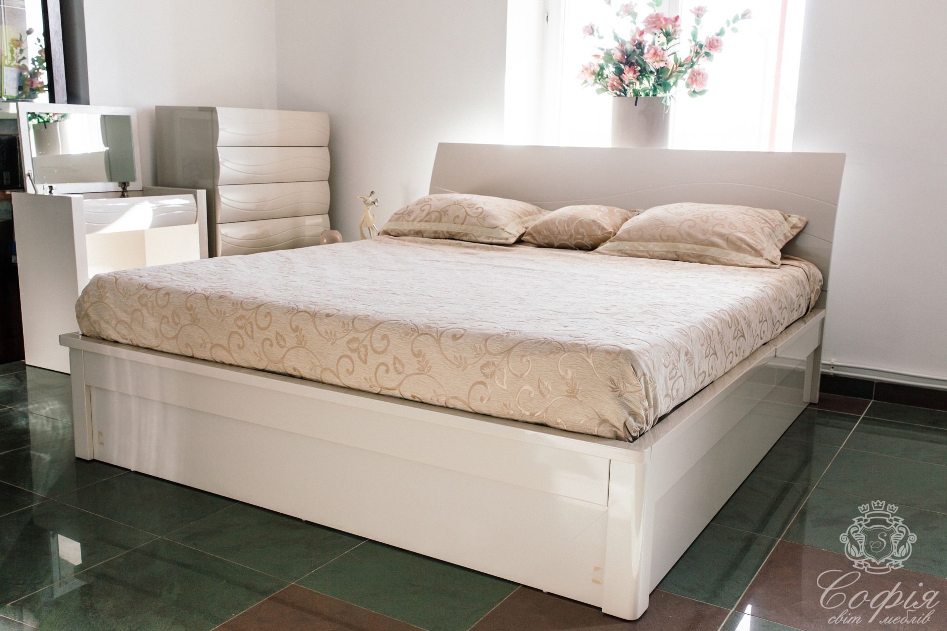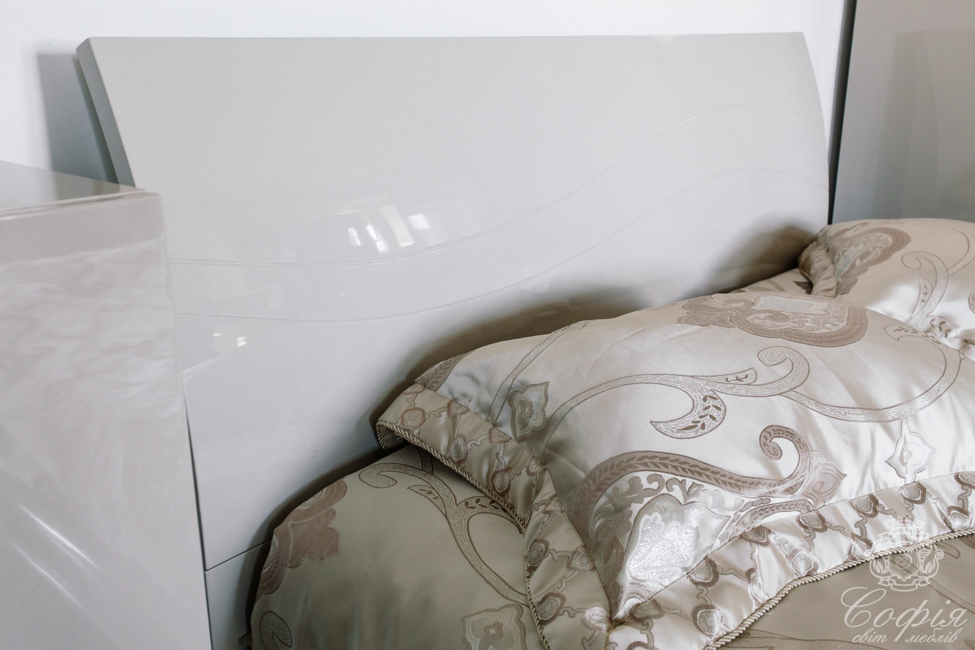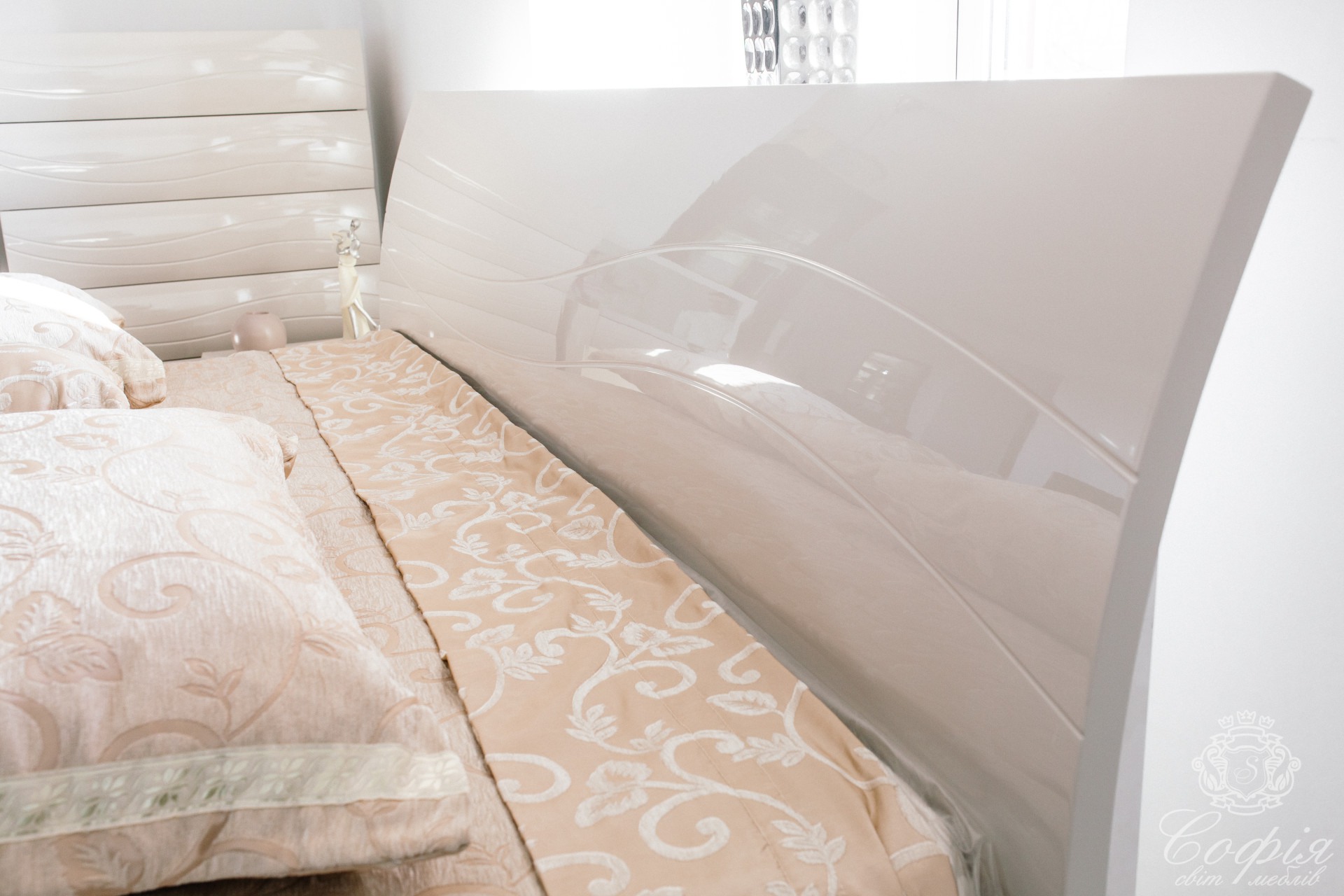 Спальня Тиффани от Мир Мебели София покрыта устойчивой глянцевой краской. Цвет айвори добавляет света в интерьере, а волнистые линии на фасадах элементов – элегантности.