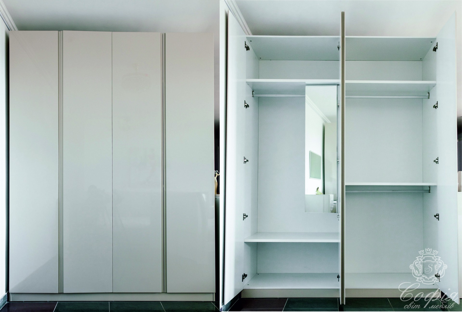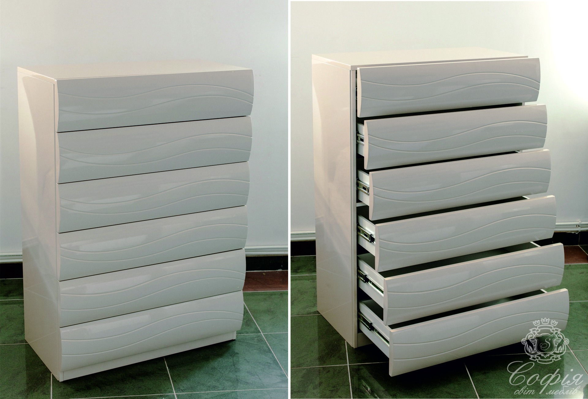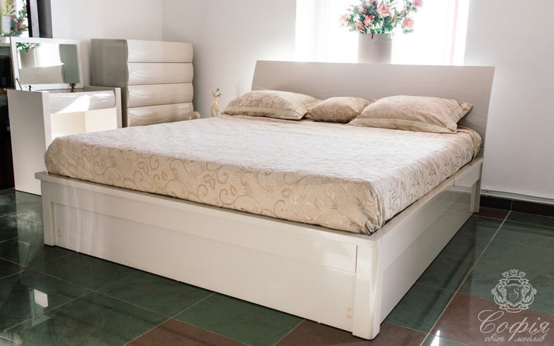 Спальня Тиффани от Мир Мебели София покрыта устойчивой глянцевой краской. Цвет айвори добавляет света в интерьере, а волнистые линии на фасадах элементов – элегантности.