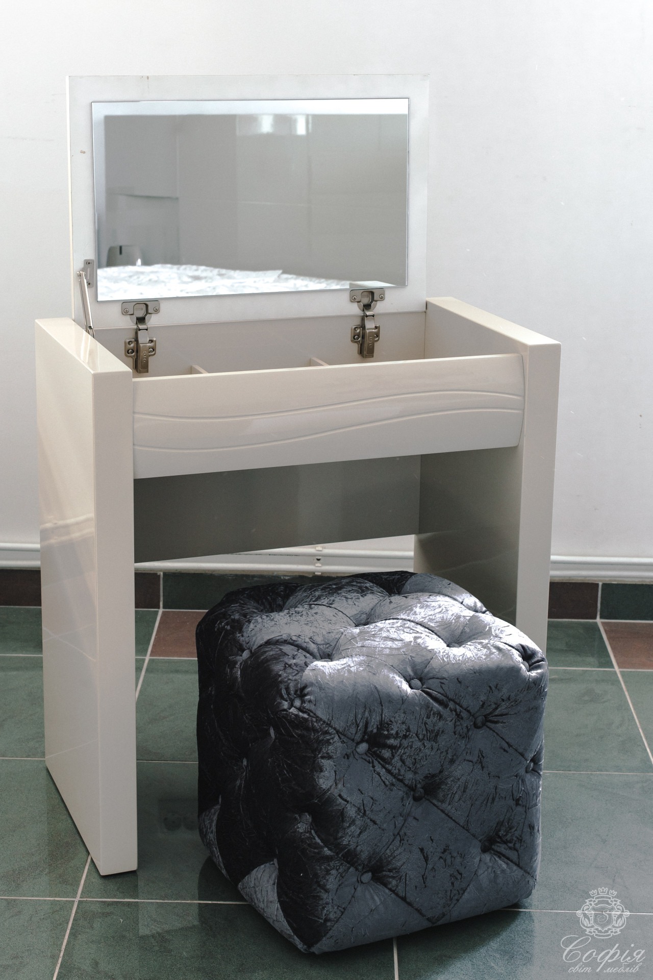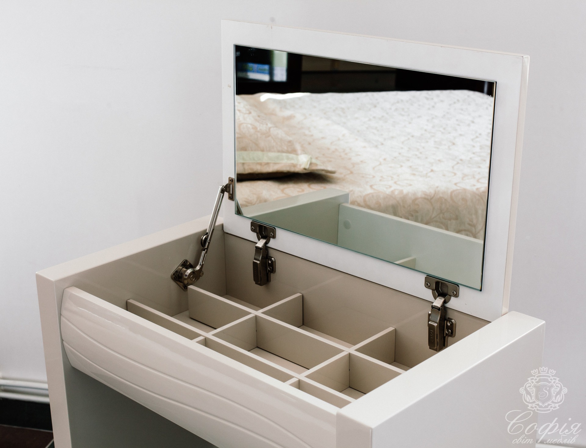Туалетный столик с зеркалом Тиффани (710*390*750 мм) с легкостью станет излюбленным элементом гарнитура. Из небольшого письменного столика он превращается в столик с зеркалом благодаря секретному подъемному механизму. Этот механизм скроет содержимое столика от посторонних глаз. Отсеки для хранения вместят множество милых сердцу штучек или же средств по уходу.
