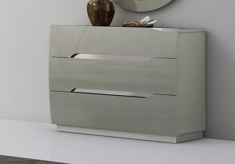 Особенностью гарнитура являются выгнутое изголовье с фигурной нишей, отсутствие выступающих ручек и оригинальные опоры кровати.