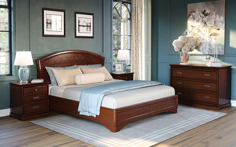 Кровать гарнитура спальня Венеция выполняется с низким изножьем и высоким изголовьем, напоминающем по форме парус – боковины слегка расходятся к верху, а верхняя часть имеет округлый вид. Заполнение рамки изголовья сделано из щита МДФ и декорировано изящной фрезеровкой с неповторимым растительным узором. Все это делает спальню Венеция в целом очень легкой, нежной и изящной.