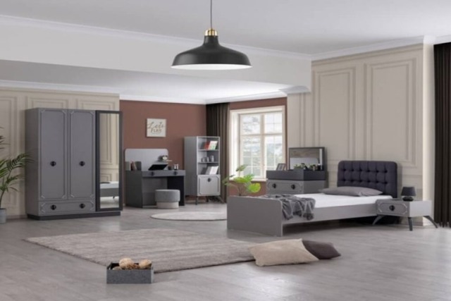 Серая мебель Стиль – прекрасный выбор в комнату для мальчика. В коллекции Стиль есть полный комплект необходимый для ребенка – кровать, тумбочки прикроватные, комод для белья, шкаф, письменный стол, этажерка.