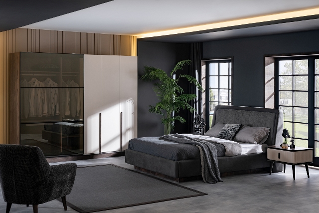 Современная мебель для спальни Бровн представлена в нашем магазине мебели в Киеве. В этом спальном гарнитуре мягкая кровать в сером цвете ( кровать можно заказать в любом цвете ткани) хорошо гармонирует с тумбочками, комодом и шкафом из этой коллекции.