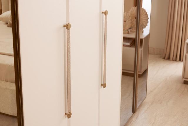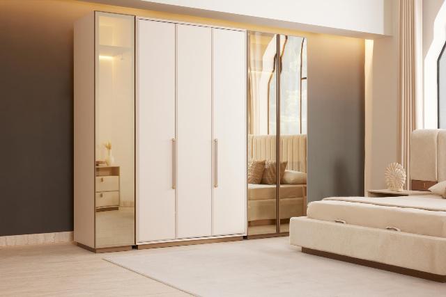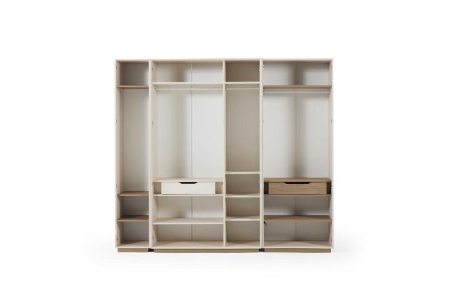 Шестидверный шкаф укомплектован штангами для вешалок, ящиками для мелких вещей и полками для белья.
