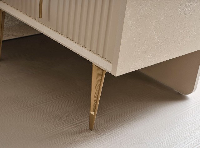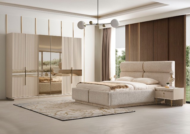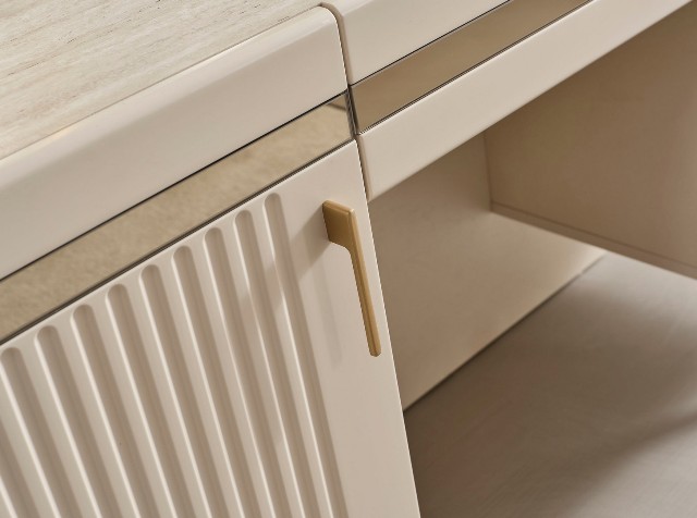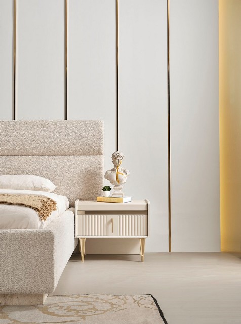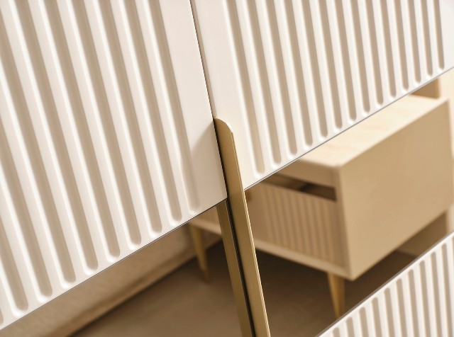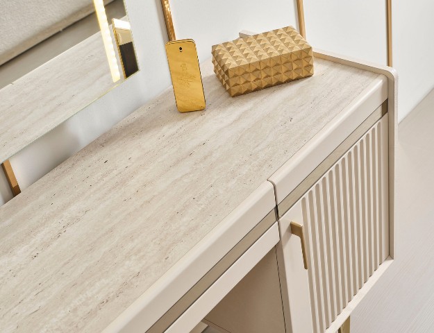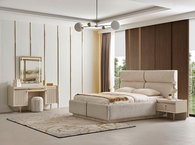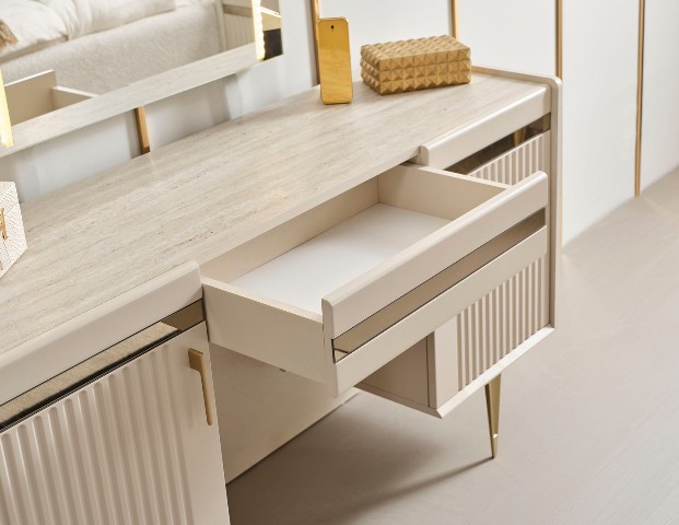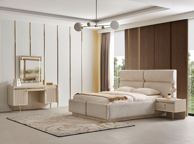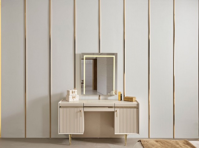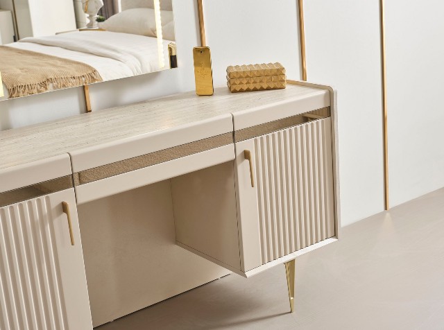 Красивая современная мебель для спальни Тесла от турецкой фабрики производителя сделана из МДФ высокого качества в нежном, теплом белом цвете – экрю. Спальню Тесла можно купить полным комплектом, а можно заказать отдельными элементами мебели – кровать, тумбочки, туалетный столик, шкаф. Спальня интересна по своим отделкам фасадов в гармонии с золотой фурнитурой.