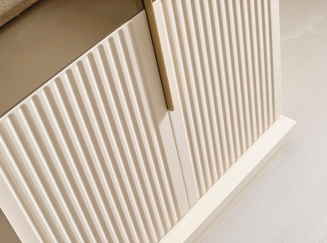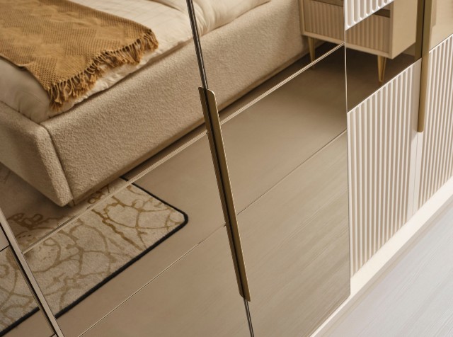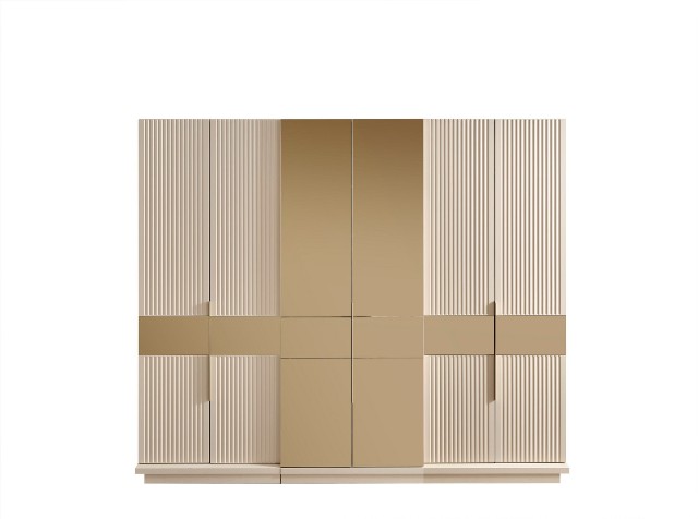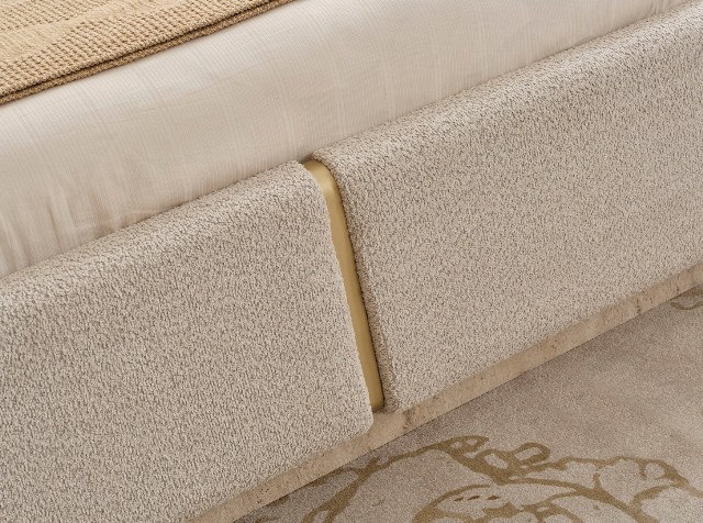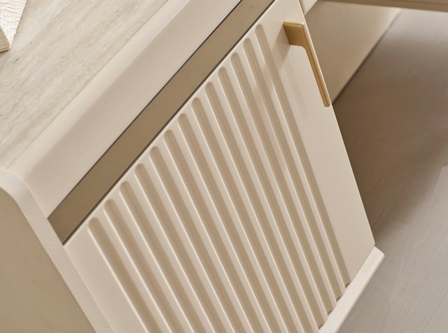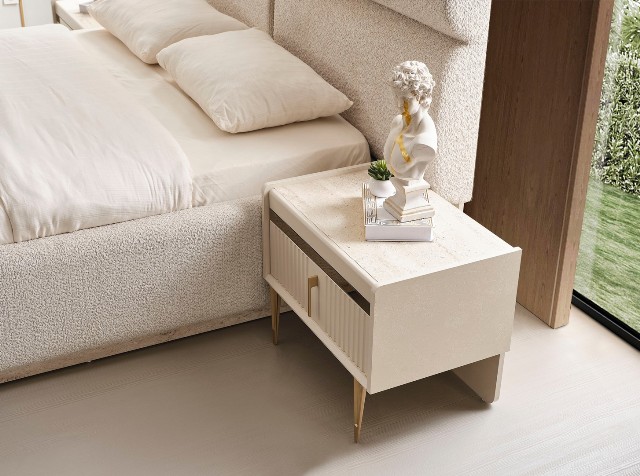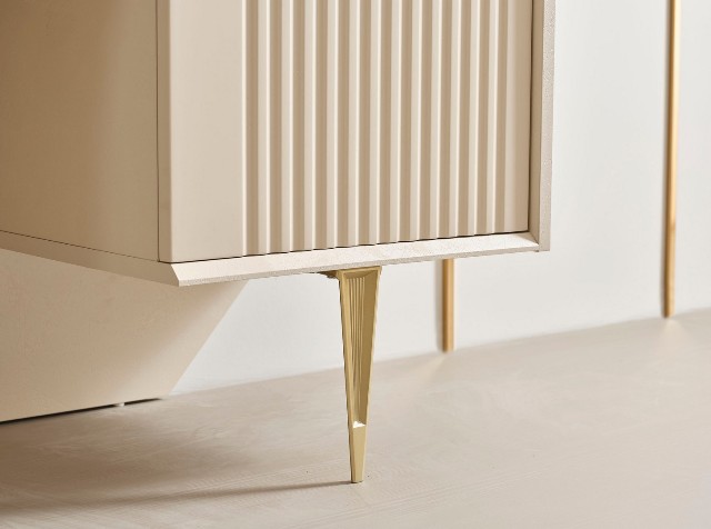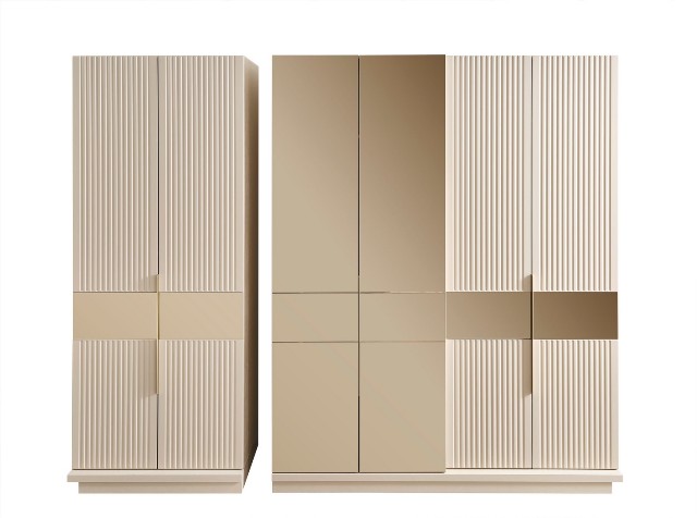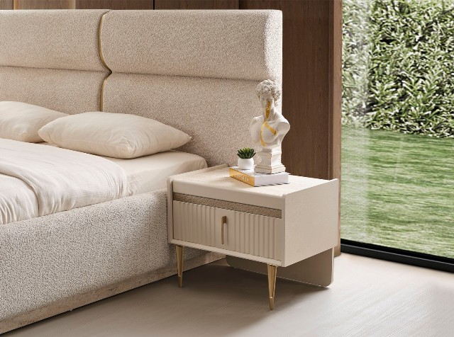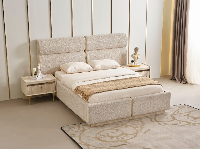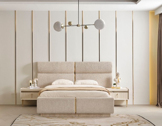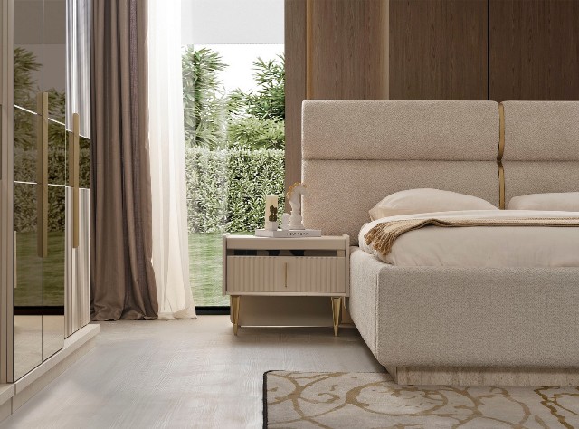 Красивая современная мебель для спальни Тесла от турецкой фабрики производителя сделана из МДФ высокого качества в нежном, теплом белом цвете – экрю. Спальню Тесла можно купить полным комплектом, а можно заказать отдельными элементами мебели – кровать, тумбочки, туалетный столик, шкаф. Спальня интересна по своим отделкам фасадов в гармонии с золотой фурнитурой.