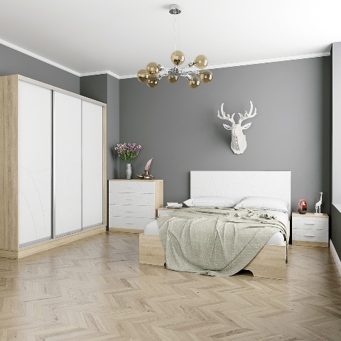 Красивая светлая спальня Лоретто выполнена из МДФ высокого качества в простых прямых формах в комбинации белого цвета и цвета натурального дерева. В этом комплекте можно заказать кровать с подъемным механизмом и нишей для белья.