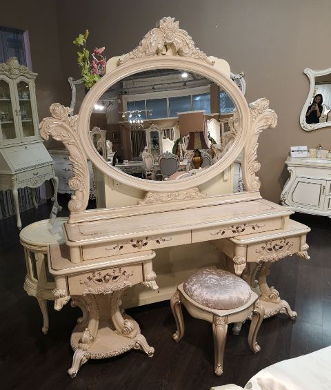 Красивый резной туалетный столик Ренессанс представлен в нашем магазине мебели в Киеве. Столик выполнен в классическом стиле с элементами барокко. Столик имеет нежную глянцевую фактуру с эффектом мрамора. Такой столик красиво будет смотреться и в спальне и в прихожей в стиле классика. Столик Ренессанс идет в комплекте с резным зеркалом и пуфиком. Такой комплект мебели Ренессанс идеально подойдет как в интерьер со светлыми тонами так и в темных тонах.