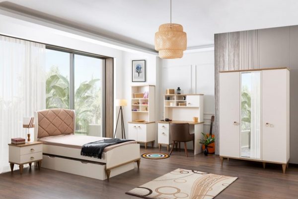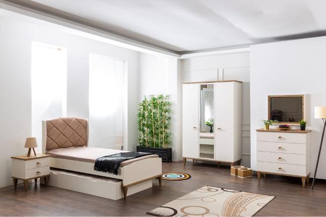 Белая мебель для спальни с декором под цвет натурального дерева Теория сделана из МДФ. Вы сможете купить полный комплект детской мебели или выбрать определенные элементы мебели. Такая мебель подойдет в молодежную комнату как мальчикам так и девочкам.