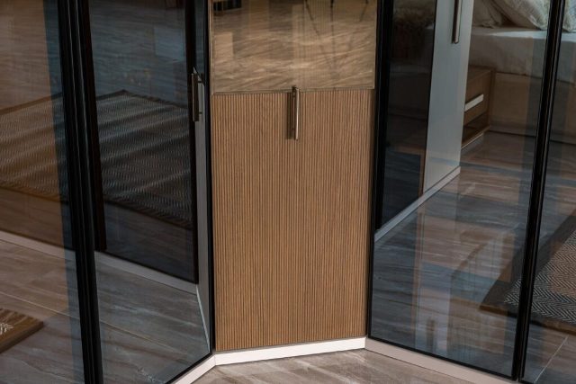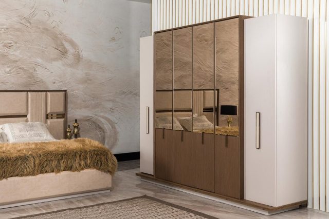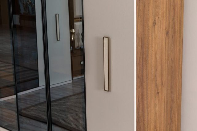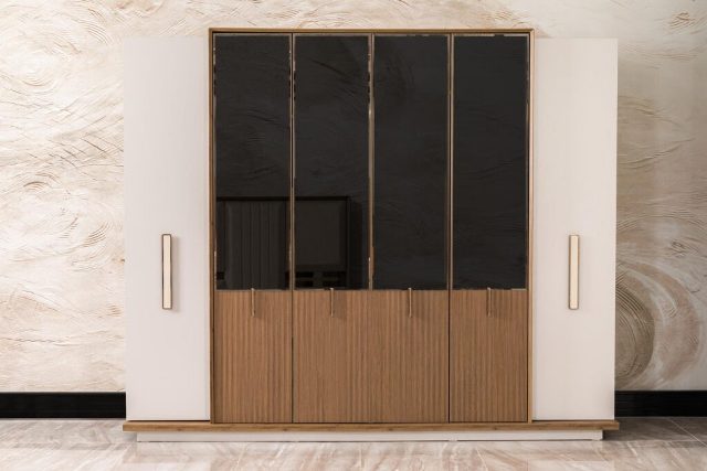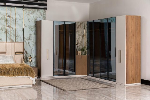 Угловой модульный шкаф Фокус сделан из МДФ в комбинированных цветах- белый и орех. Фасады могут быть или зеркальные или стеклянные. Можно шкаф собрать разного размера по нужным размерам.