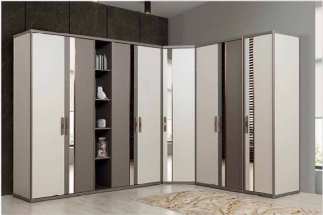 Современный угловой шкаф Атлас из МДФ Вы можете купить в нашем магазине мебели в Киеве. Шкаф модульный и можно собрать нужный шкаф по Вашим размерам. Фасады шкафа сделаны в комбинации белого, кремового и серебряных цветов. Такой шкаф будет красиво смотреться как в комплекте спальни так и самостоятельный элемент интерьера.
