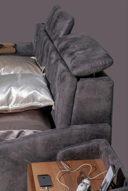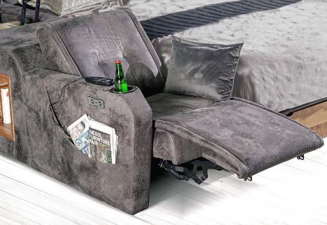 Многофункциональная кровать Нирвана со спальным местом 1600/2000 или 1800/2000. Кровать включает в себя – спальное место ( без матраса) при желании можно установить подъемный механизм, столик журнальный, кресло с реклайнером, ящики для хранения белья, сейф, мультимедийный Bluetooth-аудио, USB-вход, прикроватная тумбочка, пуф.