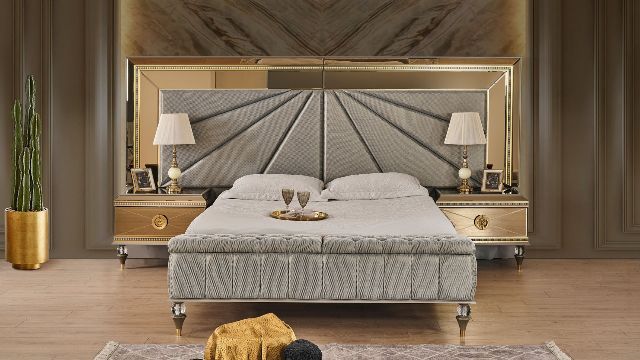 В комплект мебели вхотит двухспальная кровать с большим красивым изголовьем. На изголовье кровати выполнен объемный декоративный рисунок красивой дорогой тканью. Кровать можно покупать с тумбочками как минимальный комплект в спальню. Матрас в комплект спальни не входит, его можно купить проконсультировавшись с менеджерами нашей компании.