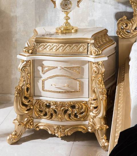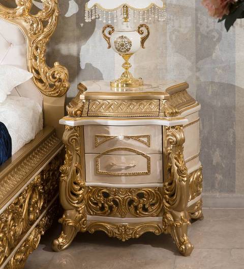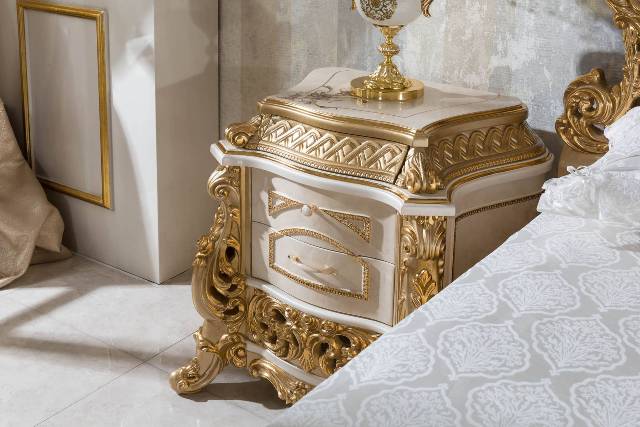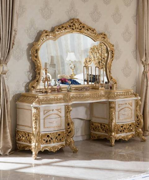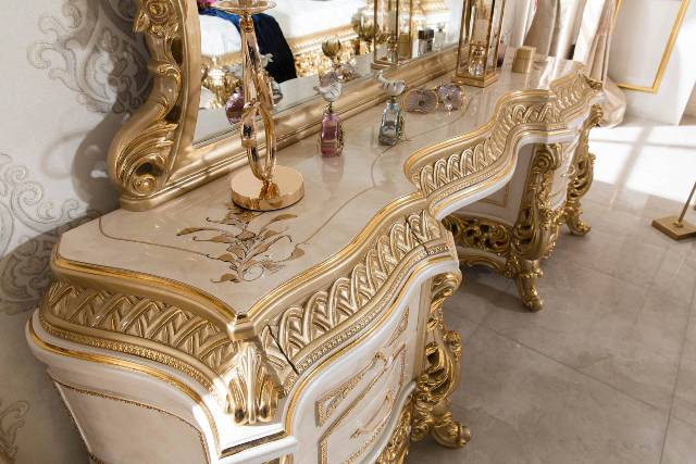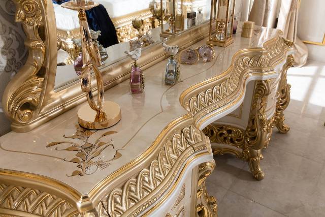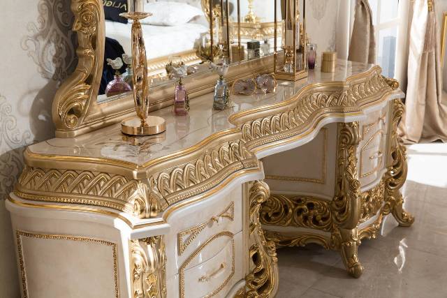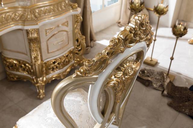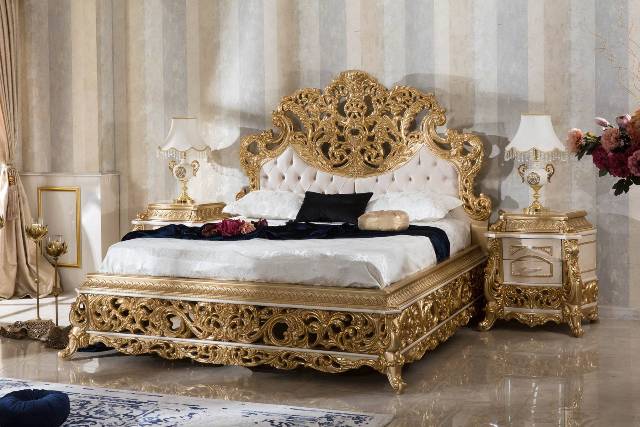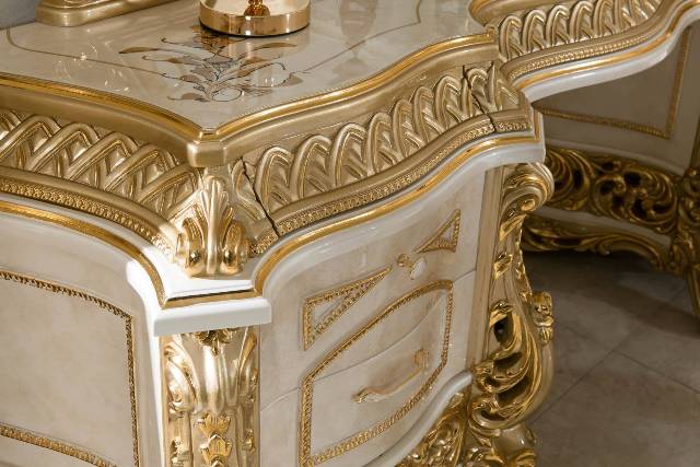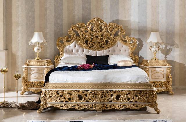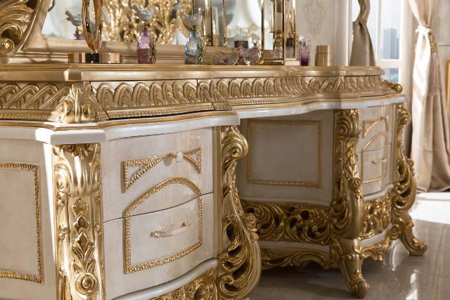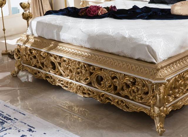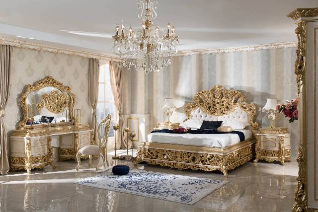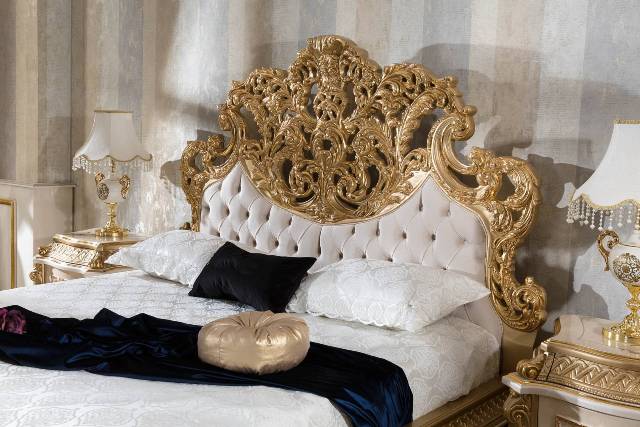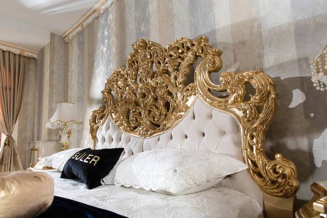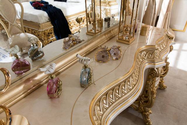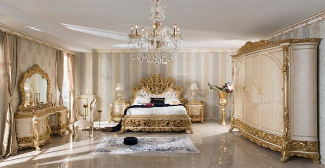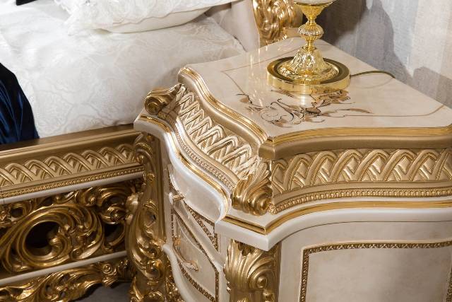 Классическая мебель для спальня Ася от турецкой фабрики производителя сделана из натурального дерева и МДФ. Спальня сделана в стиле барокко в белом цвете с золотом. Золото нанесено на все резные фигурные части спальни. Фасады украшены золотой интарсией, что придает спальне богатый вид. Такую спальню можно устанавливать как в квартиру так и в частном доме.