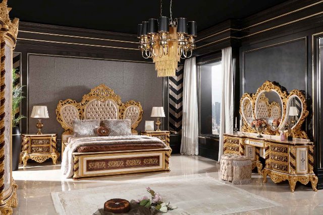Классическая мебель для спальни Капелла от турецкой фабрики производителя сделана из натурального дерева и МДФ в золотой патине.