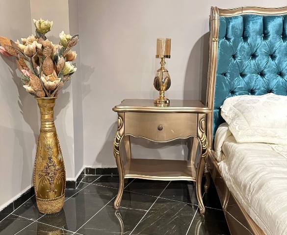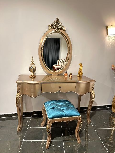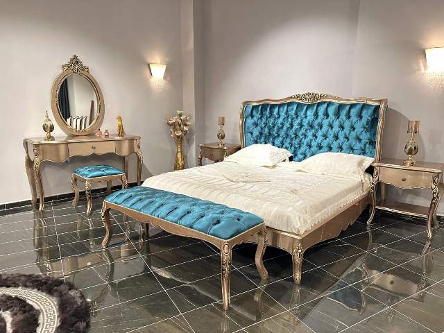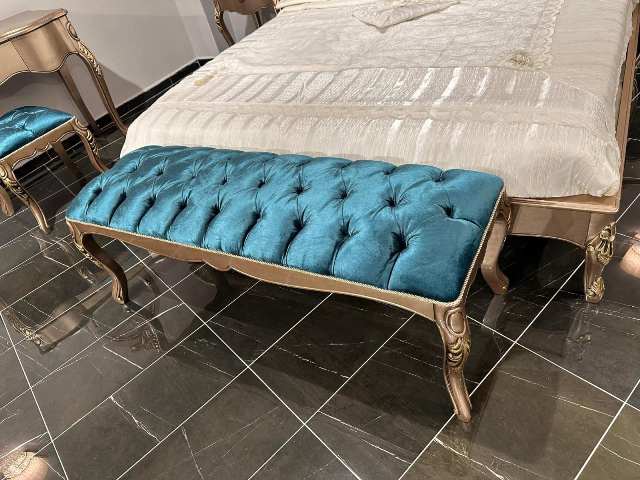 Красивая классическая мебель в спальню Венеция спальня сделана в золотом цвете фасадов с бюрюзовой обивкой на изголовье кровати, пуфике и банкетке. Ткань можно подобрать другого цвета по каталогу.