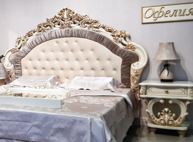 1. Кровать с высоким изголовьем выделяется плавными линиями и изысканным декором. Изголовье обито мягкой экокожей и пикировано пуговицами. Резные декоративные элементы в стиле Барокко придают спальне роскошный вид. Производитель предложил кровати со спальным местом 1,6 и 1,8, поэтому каждый клиент сможет найти подходящие изделие, в зависимости от личных предпочтений и габаритов помещения. Размеры: