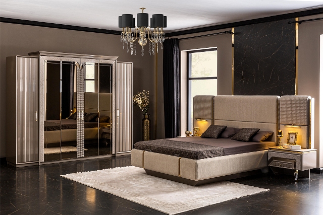 Гарну турецьку спальню Стар у стилі модерн можна купити у нашому магазині меблів у Києві. Спальня виконана із МДФ високої якості із золотим дзеркальним декором. Така спальня стане окрасою Вашого інтер’єру у будь-якому кольоровому рішенні зі стилем. У комплект спальні входить – двоспальне ліжко, тумбочки, туалетний столик з дзеркалом, пуф, шафа. Шафа модульна і можна купити шафу 4 дверей або 6 дверей.