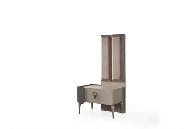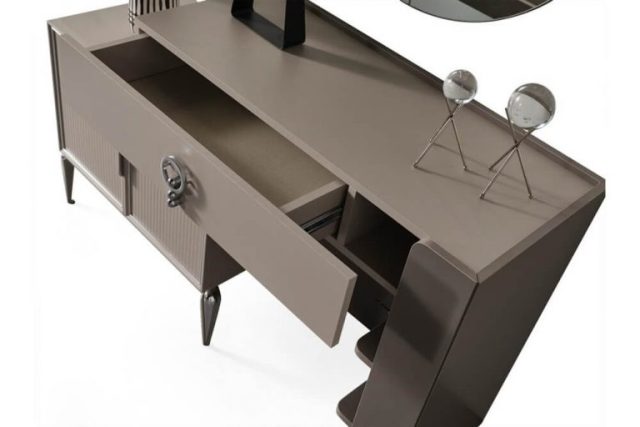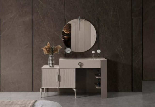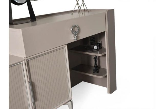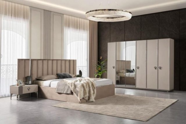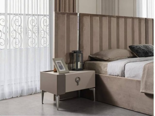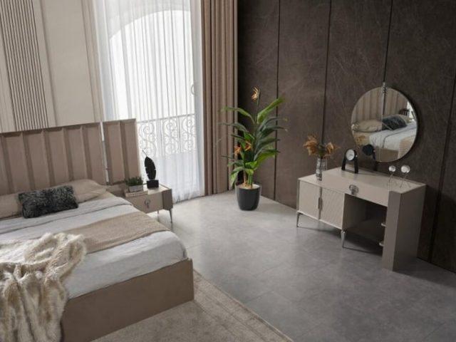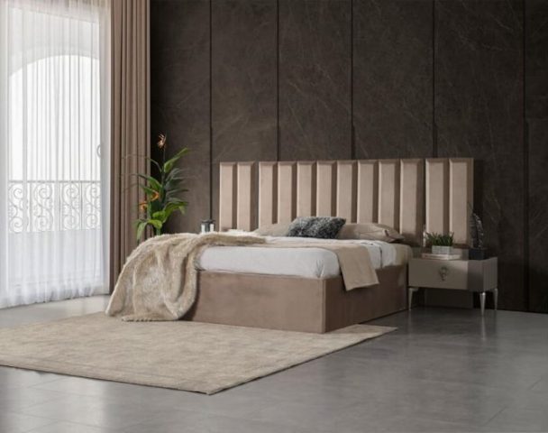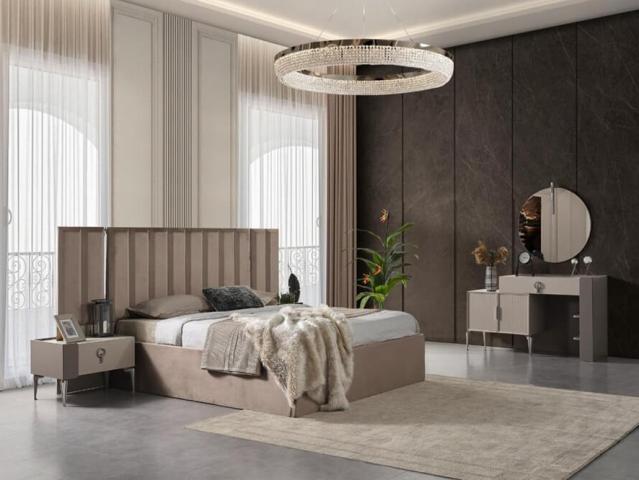 Бежеві сучасні меблі для спальні Осло від турецької фабрики виробника представлені в нашому магазині меблів у Києві. Велике двоспальне ліжко з м’яким узголів’ям може бути обладнане підйомним механізмом. У комплекті ліжко та 2 тумбочки з панно створює дуже гарний комплект для відпочинку. Додатково можна купити туалетний столик із дзеркалом та шафу на 6 дверей.