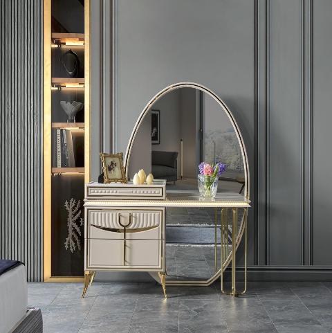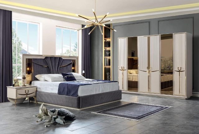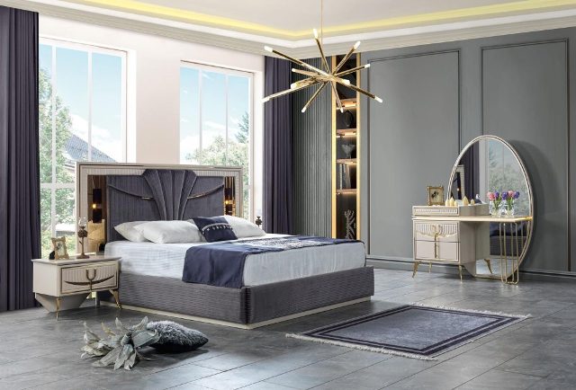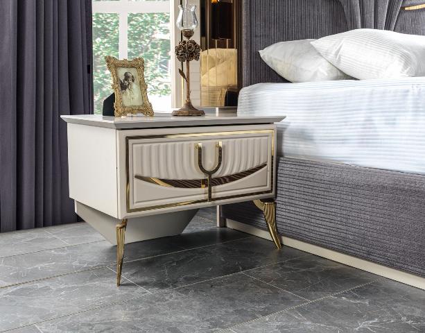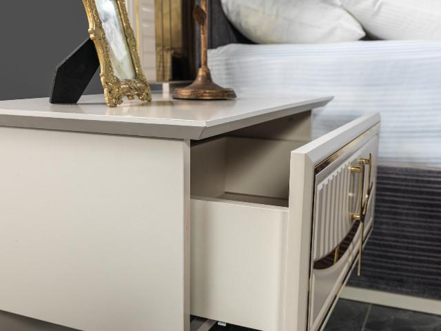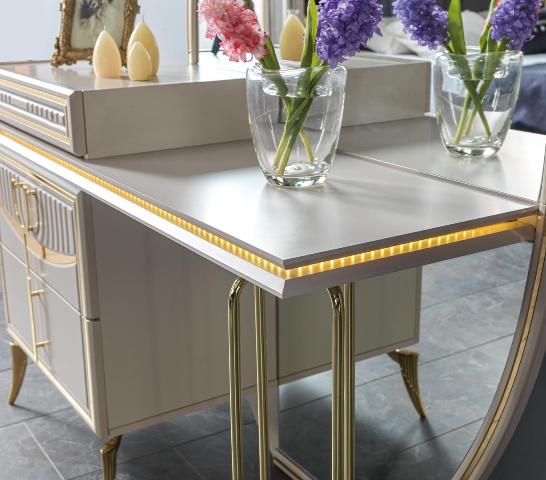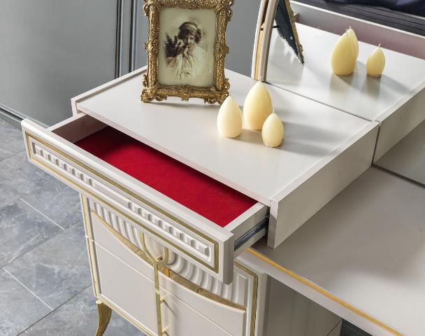Гарні меблі для спальні Валентино від турецької фабрики виробника із МДФ високої якості із золотим декором. Ліжко з підйомним механізмом у розмірі 1600*2000 та 1800*2000. Спальню можна купувати комплектом із замовити по окремих одиницях меблів – ліжко, тумбочки, туалетний стіл, шафа.