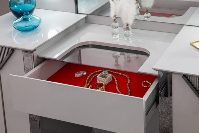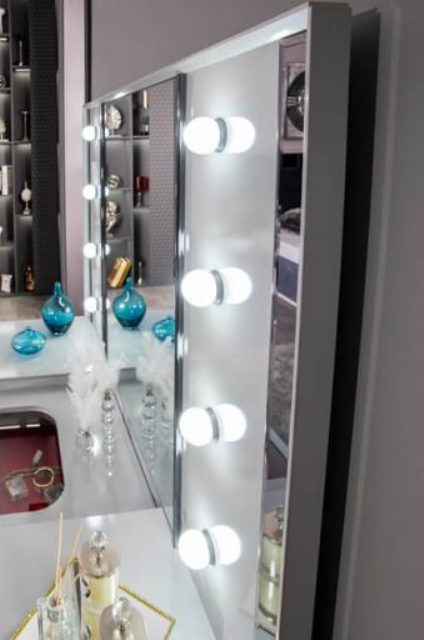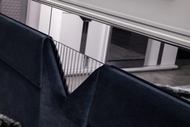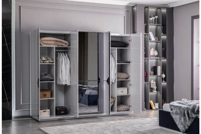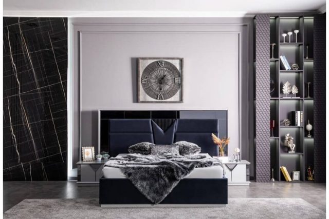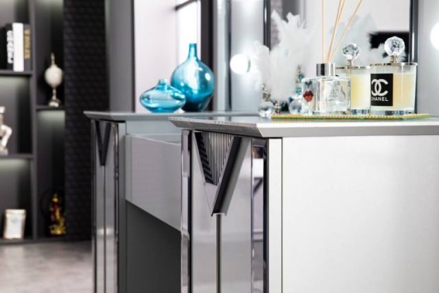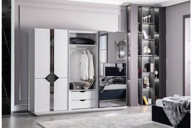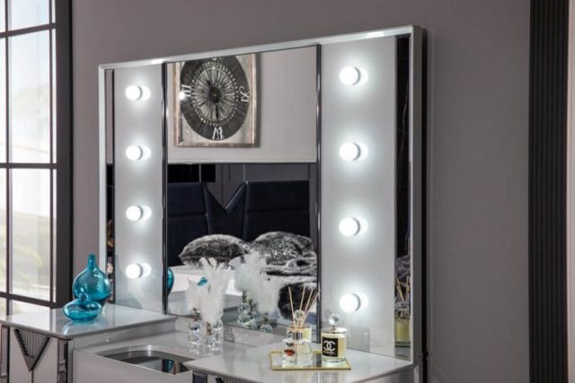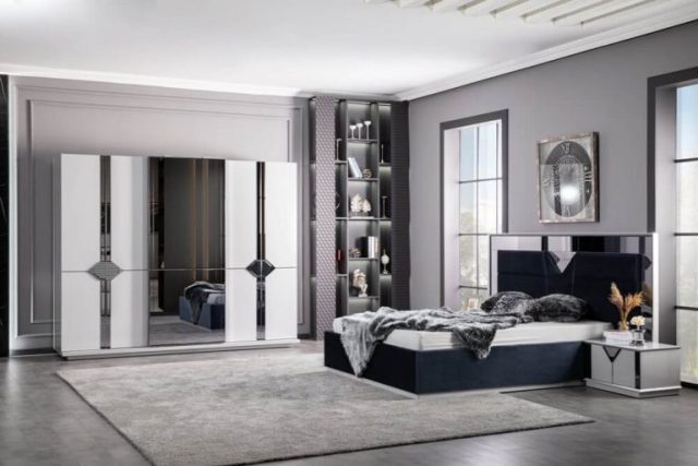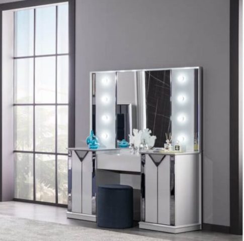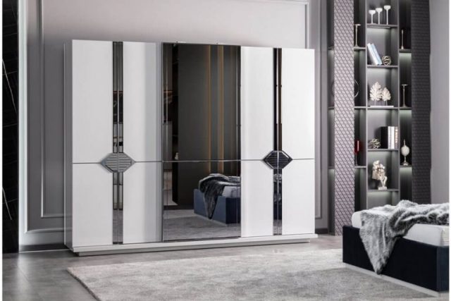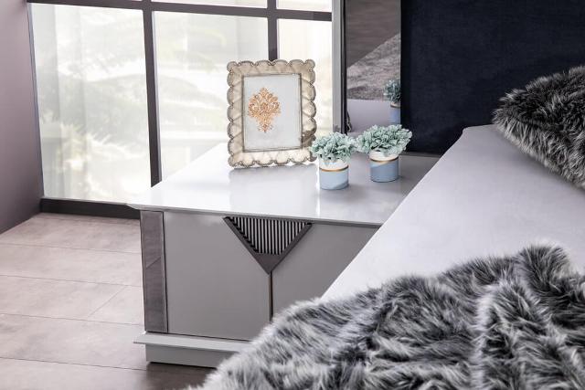 Сучасні меблі для спальні Форте із білого МДФ із сріблом та дзеркалами. Спальня представлена у стилі модерн, АРТ-Деко. Ви можете купити ліжко із підйомним механізмом або без нього. Також можна купити спальню повним комплектом або по елементах меблів окремо-ліжко, 2 тумбочки, туалетний стіл з дзеркалом, шафа 6 дверей.