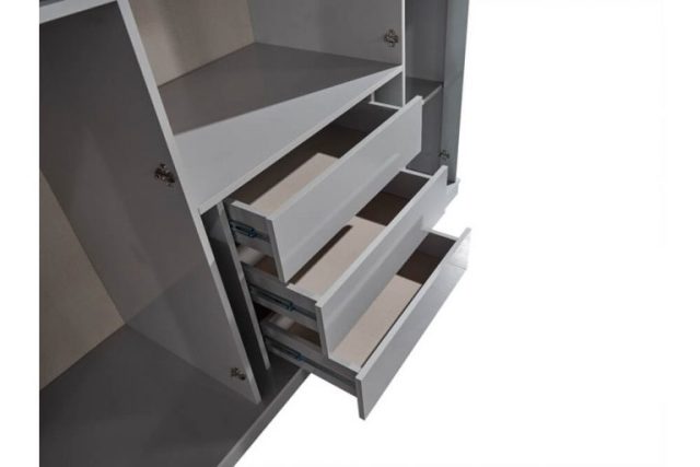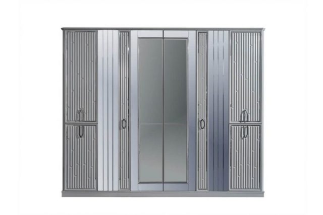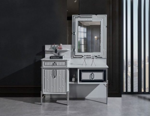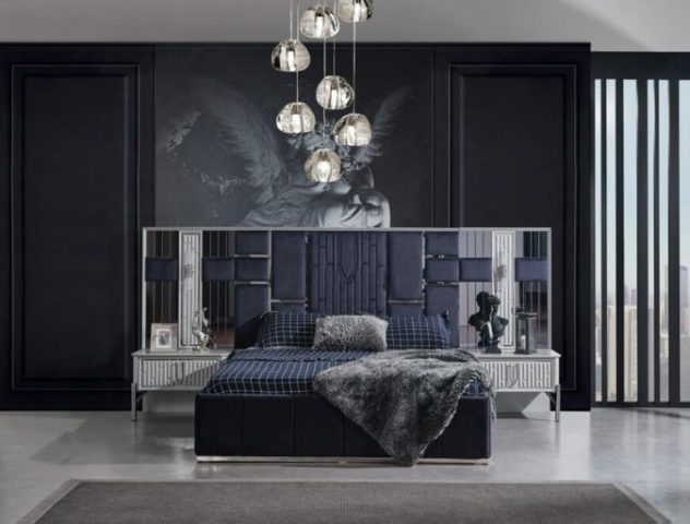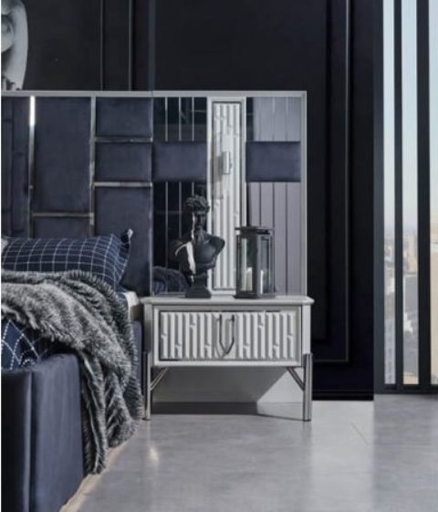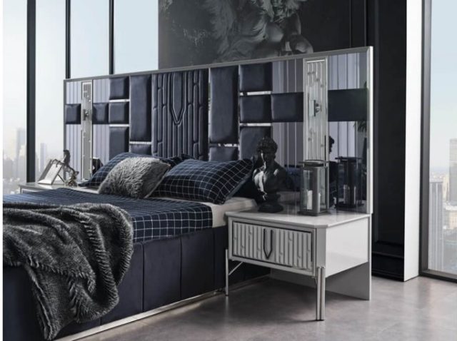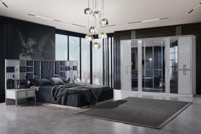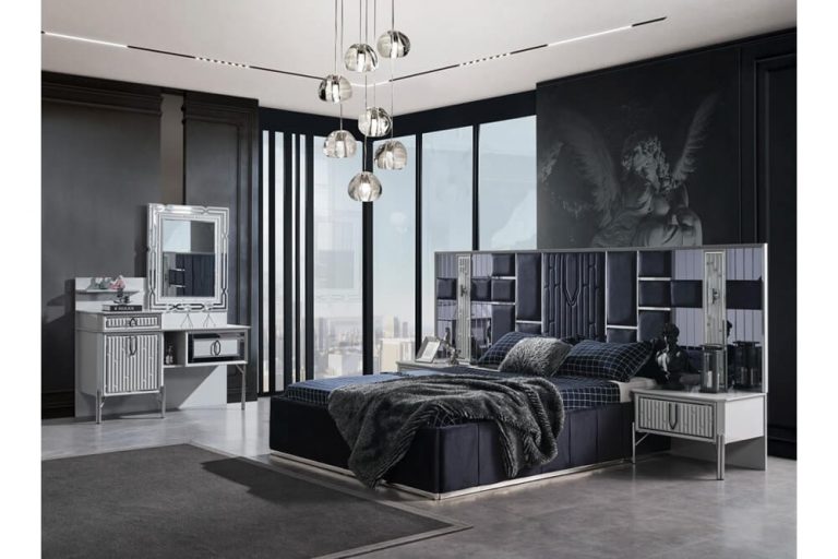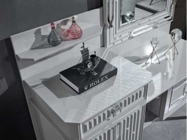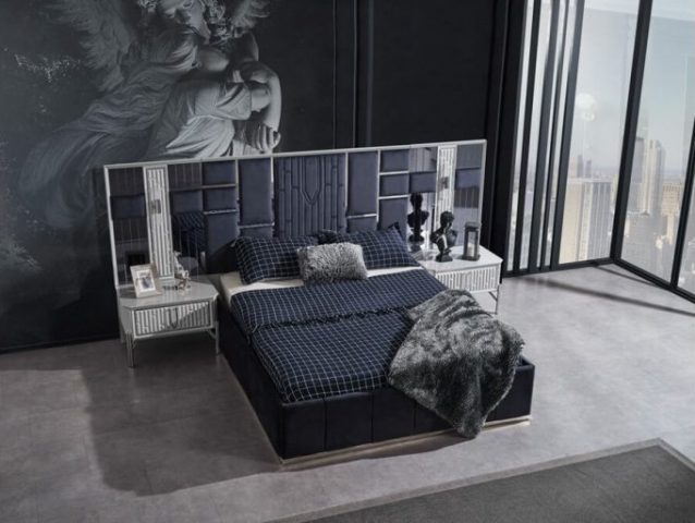 Красива біла спальня Седеф з МДФ високої якості. Вся спальня Седеф виконана срібним декором. Ліжко оздоблене синьою велюровою тканиною із дзеркальними вставками, що надає цій спальні краси та багатства в інтер’єрі.