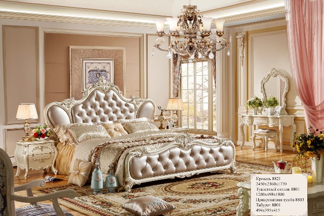 Білі класичні меблі для спальні Анжеліка в розмірі L2450*W2360*H1770 зі спальним місцем 2000*2000. Ліжко зроблене з м’яким різьбленим узголів’ям з камінням Сваровськи. Ліжко може бути обшите тканиною або еко-шкірою. Тумбочки можна підібрати за каталогом. У цій колекції є кілька типів тумбочок, туалетних столів, шаф.