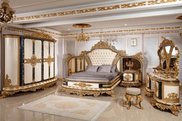 Красиві білі меблі для спальні із золотом Султан із натурального дерева в стилі бароко. Меблі зроблені з натурального дерева та МДФ. Красиві золоті різьблені візерунки на всіх меблях красиво доповнюють спальню. Велике високе узголів’я виконане у стилі капітоні у дорогій тканині. Можна купувати повним комплектом – ліжко, тумбочки, туалетний стіл, шафа.
