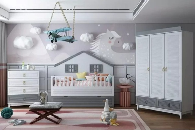 Набір меблів в дитячу кімнату Будиночок представлений у нашому інтернет-магазині меблів у Києві. Меблі виготовлені з МДФ високої якості від турецької фабрики виробника. З колекції меблів Будиночок Ви зможете підібрати меблі як для дівчаток так і для хлопчиків. У комплекті меблів Будиночок у дитячу кімнату є ліжко зі спальним місцем 90*2000 із захисним бортником, під ліжечком висувний ящик для іграшок, комод для білизни та шафа для одягу.